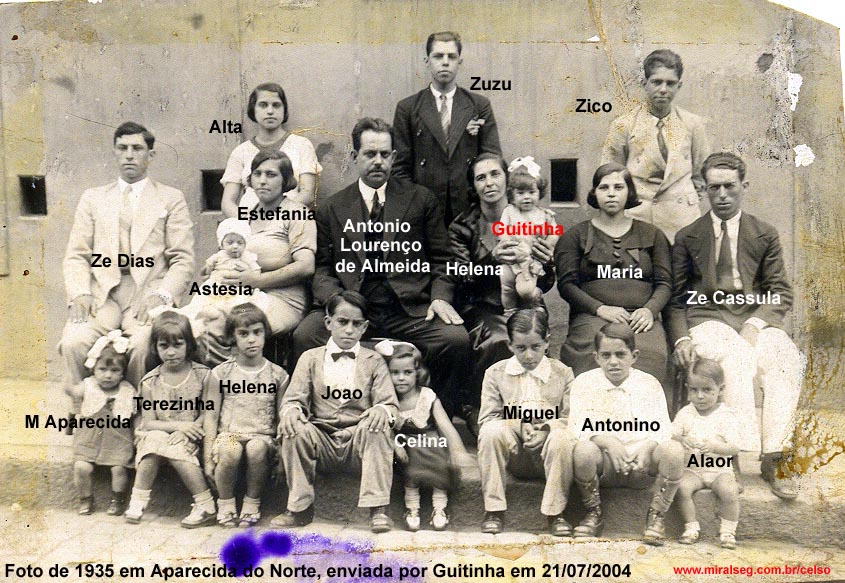 Sebastião Balieiro." 13/08/2004 - Diane Balieiro - marketing@caviglia.com.br, filha de Vivaldo Fernandes Balieiro e Irene da Silva Balieiro , irmã da Vanessa e tia do Rafael. Sobrinha de Antonio, Manoel, João, Fernando e Jaime. Neta de Otaviana Rosa de Jesus e Jackson Fernandes Balieiro. 13/08/2004 - Diane Balieiro - marketing@caviglia.com.br -Eu realmente estou muito interessada em descobrir meus parentes, pois como eu disse... de "Balieiro".. só conheço meu pai e minha irmã. Conversei com meu pai e ele não tem certeza sobre os nomes dos avós paternos, diz que lembra vagamente que o avô era alguma coisa com Gal, mas não acha q era Galdino, e sim Galdêncio.. resumindo, não é uma fonte muito confiável... :( Eu fiz a árvore considerando que meus bisavós fossem A Sra. Antuninha e o Sr. Galdino, conforme suas previsões... veja anexa. Estive pensando: a única forma de eu ter certeza, seria encontrar um dos "Fernandes Balieiro" irmãos do meu pai e assim perguntar sobre os avós deles. Vou falar o que sei sobre o meu avô Jack: Ele conheceu minha avó na Bahia e foram morar em uma cidade chamada Rio Verde. Depois mudaram-se para Sebastianópolis do Sul, onde meu pai nasceu. Quando meu pai tinha uns 14 anos, meu avô Jack foi embora de casa e nunca mais soube-se nada dele.... Pode até ser que ele tenha contruído uma nova família. Espero que as informações possam ser úteis e que nossos filhos e netos tenham informação de seus parentescos! Parabéns pela sua iniciativa e disposição para reunir todos este dados! .. e se eu puder ajudar: Conte comigo! Um abraço! 12/08/2004 - Sebastião Balieiro de Almeida - sebastiaobalieiro@bol.com.br - de Resende /RJ R Santo Antonio tel 24-3354****, visitou nossa página comercial, mas já passei o endereço desta. 12/08/2004 - Shilby Mendoza (PERU) - smendoza@minem.gob.pe - escreveu: "Hola , por curiosidad entre a tu pagina y sedcubri que hay una historia sobre el origen de la familia Motta, el cual me interezo mucho, porque yo apellido Motta, bueno me gustaria saber si hay una pagina traducida al español referente a la historia. Gracias." 22/07/2004- Guillhermina Balieiro de Almeida (Guitinha) - jacrossetti@uol.com.br - enviou, gentilmente, esta FOTO de 1935 (clique aqui).